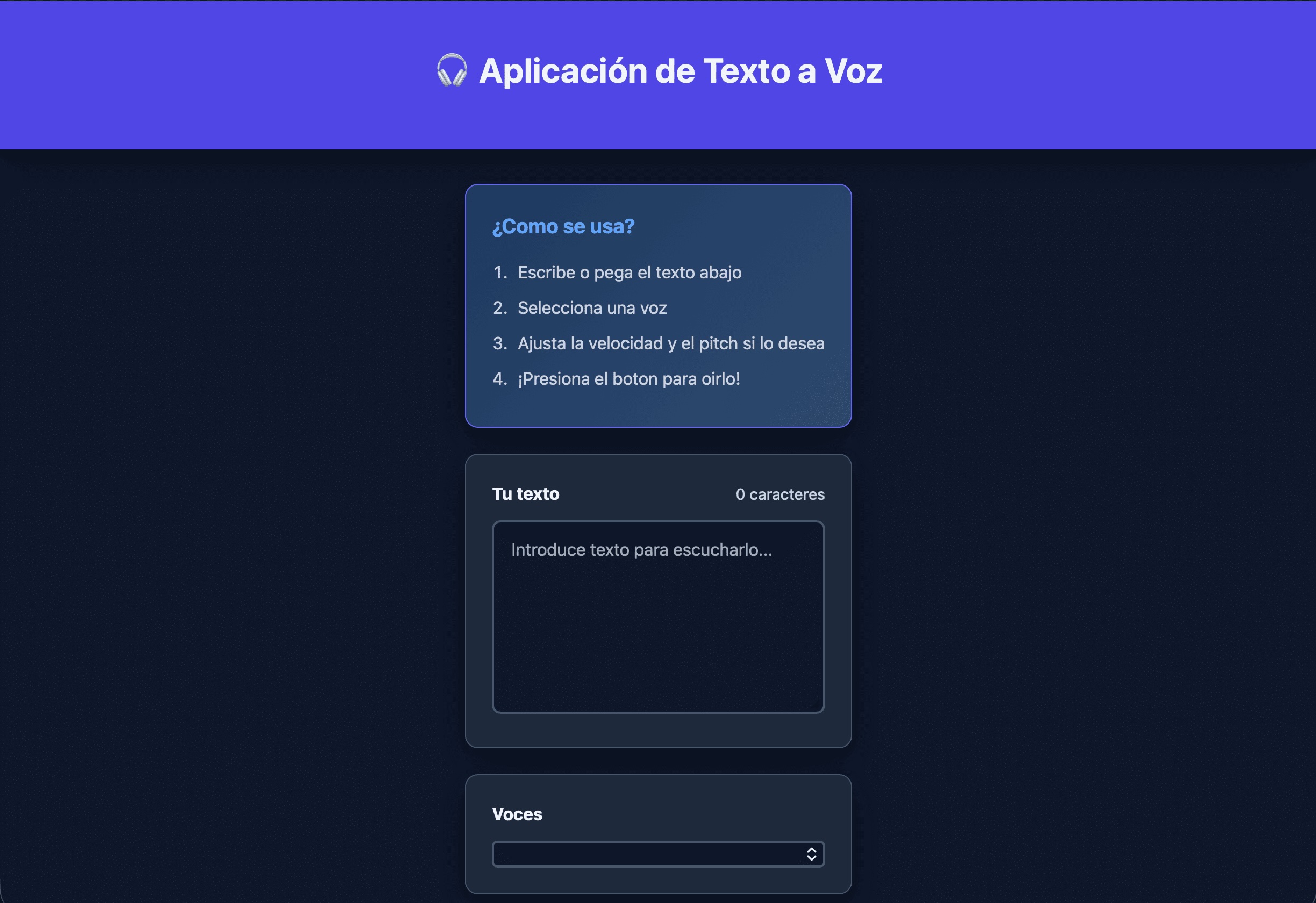 Aplicación web que convierte texto en voz, permite elegir voz y ajustar velocidad y tono.